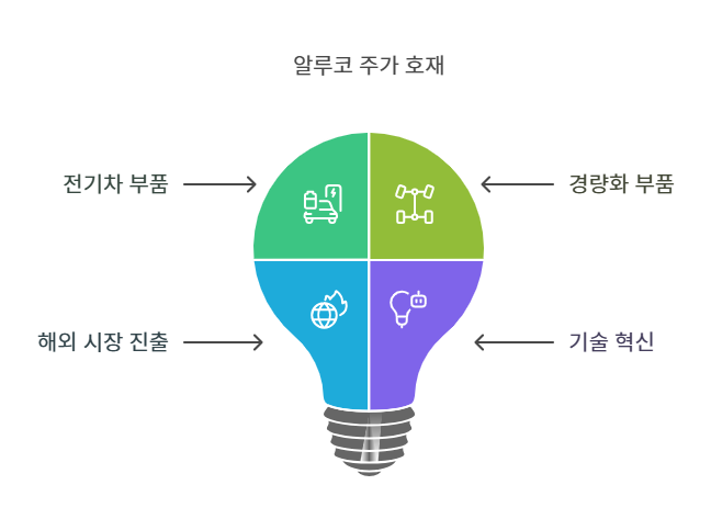알루코는 자동차, 철도, 선박 등 운송 산업에서 알루미늄 경량화 부품을 공급한다. 탄소 배출 저감과 연비 향상을 위한 경량 소재 수요가 높아지며 알루코의 기술력이 주목받는다. 특히, 2024년 8월 ‘알루코, 美 SK온·포드 합작사에 8천억 원 규모 배터리 케이스 공급’ 기사에서 보듯, 글로벌 대기업과의 계약이 성사되며 매출 확대 가능성이 커졌다. 알루미늄 소재의 활용도가 다양한 산업으로 확장됨에 따라 중장기 성장 기반이 강화된다.