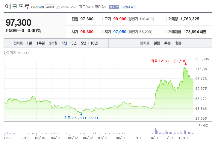 - 전반적으로 에코프로 주가는 2025년 중반부터 후반까지 친환경 산업 부문의 성장 기대를 기반으로 강하게 상승했으나, 최고점 이후 단기 조정 국면을 맞아 일부 수익 실현 현상이 나타난 패턴이다. 기술 혁신과 친환경 소재 시장 확대라는 긍정적 요인과 함께, 글로벌 경제 환경 및 공급망 이슈라는 리스크가 혼재된 흐름이다.